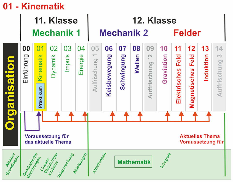 besprochene Inhalt (Kinematik - Bewegungslehre) mit den Inhalten der folgenden Kapitel zusammenhängt (rote Pfeile von Kinematik zu folgenden Kapiteln): | |