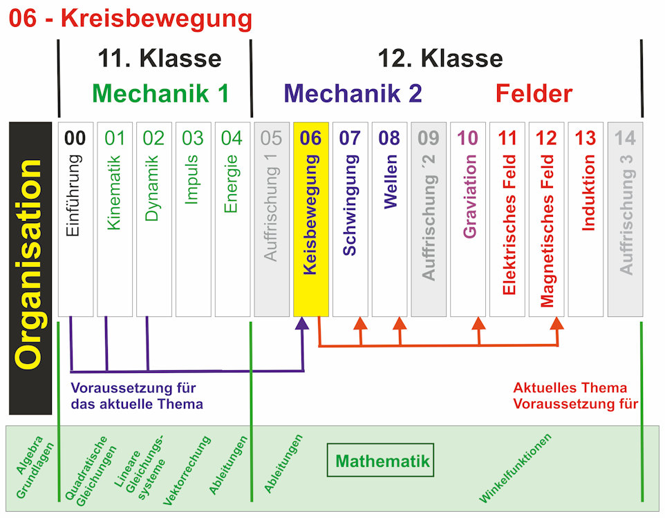 Kreisbewegungen spielen in unserem Alltag eine wichtige Rolle, sei es beim Durchfahren eines Kreisverkehrs mit dem Auto, bei der scheinbaren Bewegung des Mondes entlang einer Kreisbahn um die Erde oder Drehung des Planeten Erde um die Sonne. In diesem Kapitel lernen Sie die Physik der Kreisbewegung kennen. Die folgenden Kapitel - mechanische Schwingungen und mechanische Wellen - bauen auf dieses Kapitel auf. Dieser Auffrischungskurs wird im Bedarsfall und wenn organisatorisch möglich in den FOS-Klassen zu Beginn der 12. Jahrgangstufe abgehalten. In den BOS-Klassen soll er vor den Kreisbewegungen stattfinden. Die auf dieser Seite aufgeführten Reader sind Passwort-geschützt, die entsprechenden Arbeitsblätter nicht. | ||||