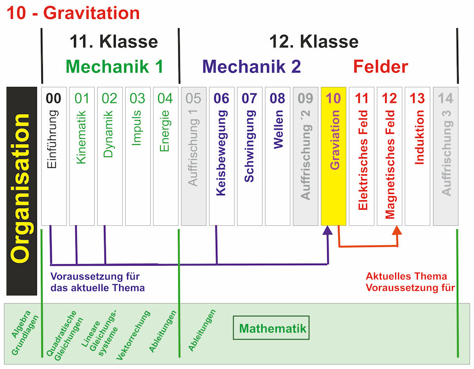 Zwei Massen ziehen sich gegenseitig an - diese Kraft wird als Newtonsche Gravitationskraft bezeichnet..Die Gravitationskraft iost verantwortlich dafür, dass sich der Mond um die Erde dreht, die Erde umd die Sonne und die Sonne um das Zentrum der Milchstrasse. In diesem Abschnitt lernen Sie, dass die Gravitation ein Feld ist und die Gravitationskraft der Erde eine Zentralkraft für den Mond ist. Gleichzeitig werden Sie in den Begriff des "physikalischen Feldes" eingeführt, der in den weiteren Themen - elektrisches und magnetische Feld - von zentraler Bedeutung ist. Dieser Auffrischungskurs wird im Bedarsfall und wenn organisatorisch möglich in der Mitte der 12. Jahrgangstufe abgehalten. | ||||