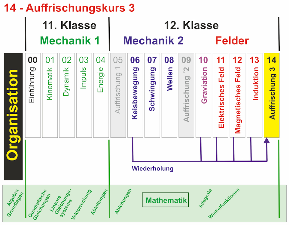 In den letzten Kapiteln der 12. Jahrgangsstufe wurde mit der Gravitation der Feldbegriff eingeführt, gefolgt von den elektrischen und den magnetischen Feldern. Mit der Induktion wurde der Lernstoff aus der 12. Klasse abgeschlossen. Ziel dieses Auffrischungskurses III ist, vor der Abschlussprüfung diese Themen nochmals zu wiederholen und dadurch zu festigen. Dieser Auffrischungskurs wird im Bedarsfall und wenn organisatorisch möglich in der Mitte der 12. Jahrgangstufe abgehalten. | |||||||